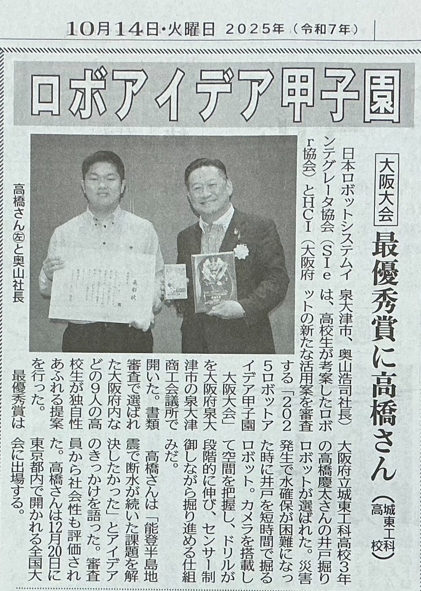 プレス・メディア 2025年10月14日(火) 日刊工業新聞に、ロボットアイデア甲子園の記事が掲載されました。 日刊工業新聞(10月14日号)に、10月4日に行われたロボットアイデア甲子園大阪大会発表会の記事が掲載されました。