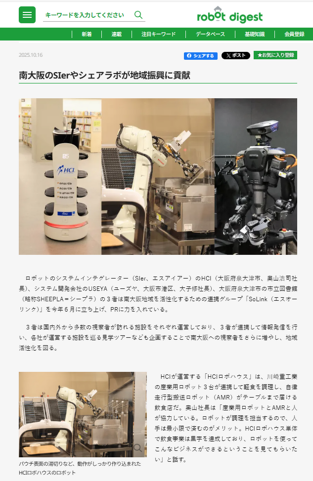 プレス・メディア 2025年10月16日(木) robot digestに、南大阪地域を活性化するための連携グループ「SoLink」について紹介された記事が掲載されました。 robot digestに、南大阪地域を活性化するための連携グループ「SoLink」について紹介された記事が掲載されました。 本サイトはこちらから