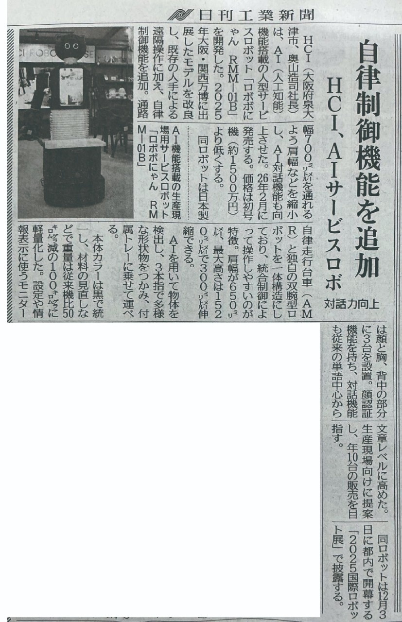 プレス・メディア 2025年12月02日(火) NEW! 日刊工業新聞に、AI(人工知能)機能搭載の人型サービスロボット「ロボボにゃんRMM-01B」の記事が掲載されました。 日刊工業新聞に、AI(人工知能)機能搭載の人型サービスロボット「ロボボにゃんRMM-01B」の記事が掲載されました。