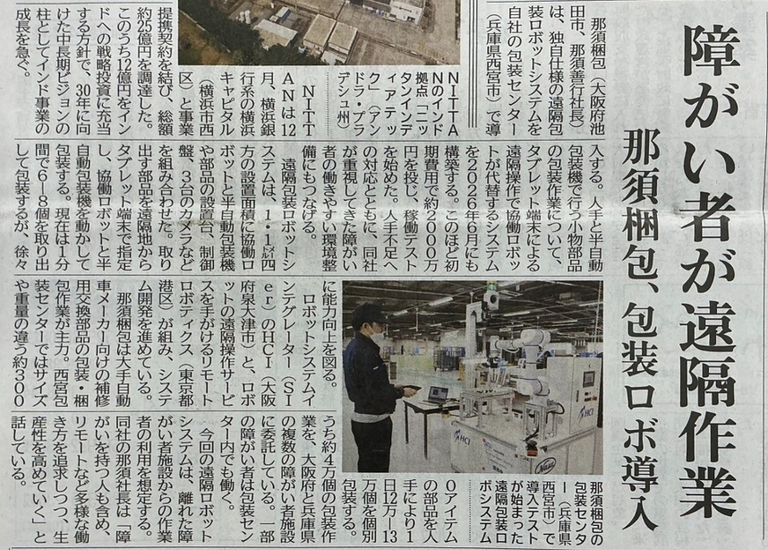 日刊工業新聞(1月7日号)に、遠隔包装ロボットシステムが掲載されました。