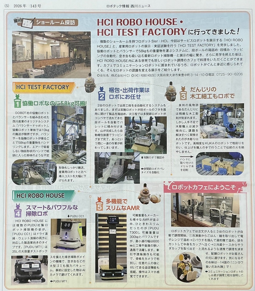 プレス・メディア 2026年01月15日(木) 西川ニュースに、HCI ROBO HOUSE・HCI TEST FACTORYが掲載されました。 西川ニュースに、HCI ROBO HOUSE・HCI TEST FACTORYが掲載されました。